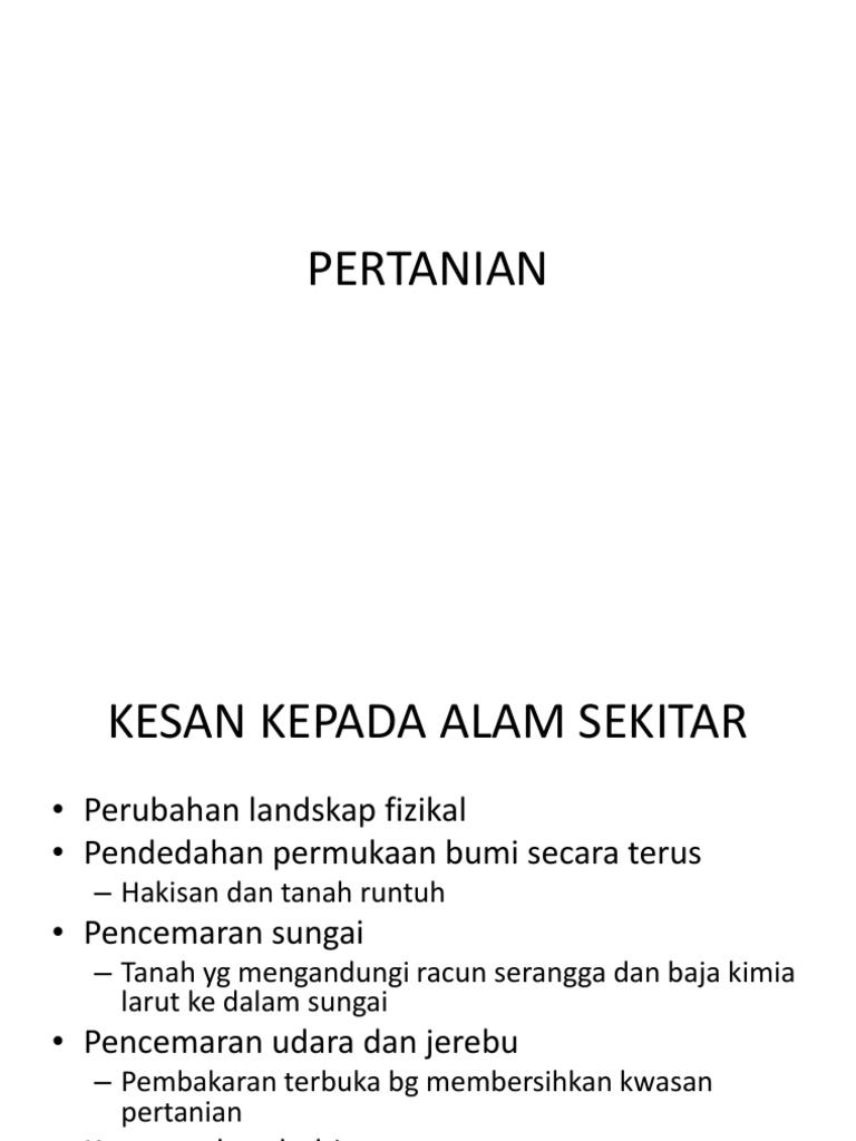 Pengairan Kawasan Pertanian Menjejaskan Ekologi Alam Sekitar Bergantung Kepada Kedudukan 31 Geografi dan Cuaca Kos Menjana Tenaga Tinggi SUMBER AIR By. Pertanian dilihat oleh masyarakat luar sebagai satu usaha menghijaukan bumi lalu menghalang berlakunya kejadian bencana alam seperti tanah runtuh yang sering dikaitkan dengan kemusnahan kawasan hutan itu. Baca versi flipbook dari NOTA KOMSAS TINGKATAN 4.